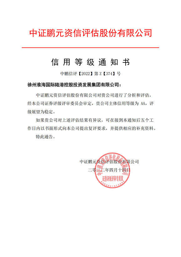 2022年4月14日,經(jīng)國(guó)內(nèi)主流評(píng)級(jí)機(jī)構(gòu)——中證鵬元資信評(píng)估股份有限公司綜合評(píng)估及審定,確定徐州淮海國(guó)際陸港控股投資發(fā)展集團(tuán)有限公司主體信用等級(jí)為AA,評(píng)級(jí)展望為穩(wěn)定。在港務(wù)區(qū)快速發(fā)展的大背景下,該評(píng)級(jí)結(jié)果具有重要的里程碑式的意義。